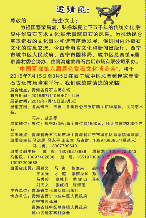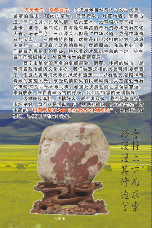 中国夏都第六届昆仑赏石文化博览会邀请函青海奇石网|三江源奇石|青海黄河奇石|青海省观赏石协会|青海奇石文化协会|三江源画面石|三江源卡通石|青海星辰石|青海民和七彩石|青海藏瓷| 青海湟中丹麻石|赏石界|青海风砺石